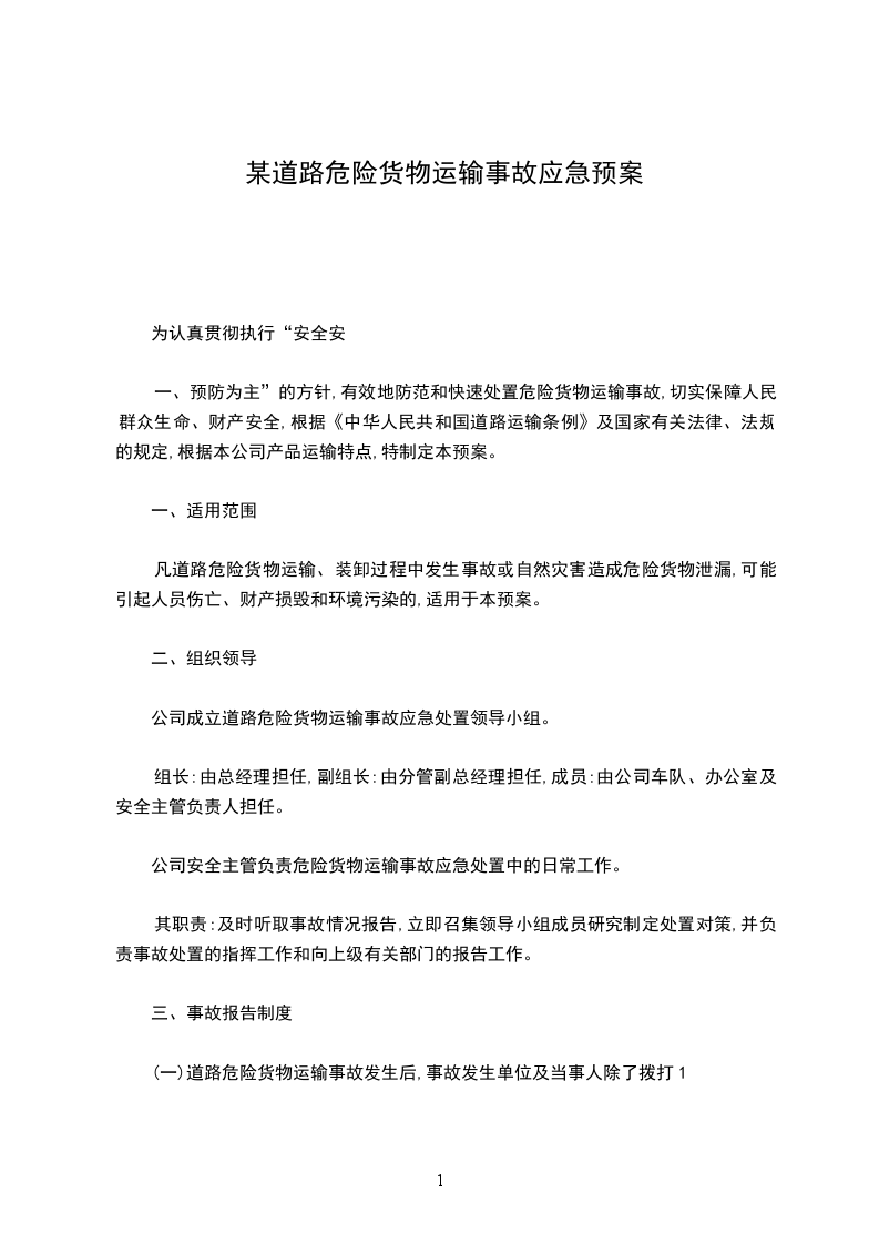 一、预防为主”的方针,有效地防范和快速处置危险货物运输事故,切实保障人民群众生命、财产安全,根据《中华人民共和国道路运输条例》及国家有关法律、法规的规定,根据本公司产品运输特点,特制定本预案。