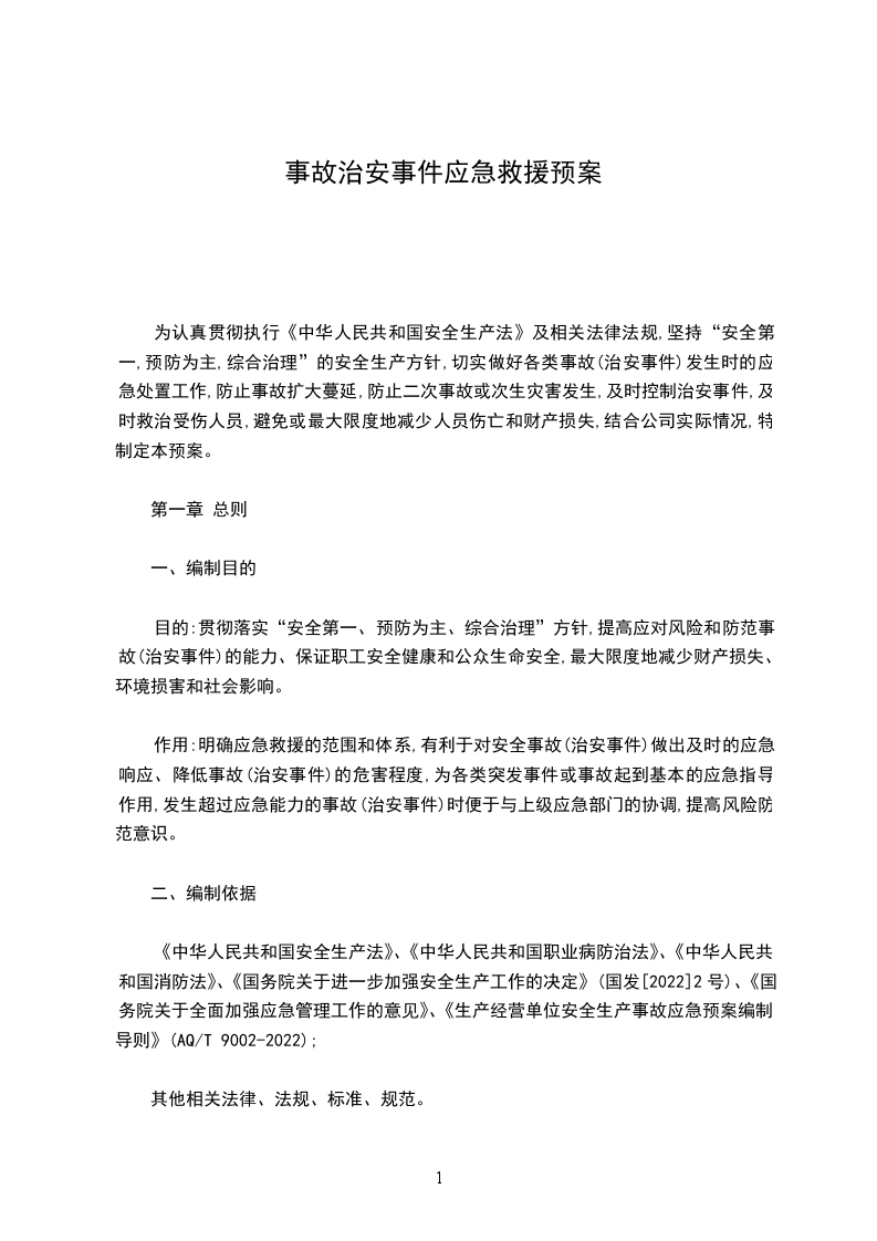 为认真贯彻执行《中华人民共和国安全生产法》及相关法律法规,坚持“安全第一,预防为主,综合治理”的安全生产方针,切实做好各类事故(治安事件)发生时的应急处置工作,防止事故扩大蔓延,防止二次事故或次生灾害发生,及时控制治安事件,及时救治受伤人员,避免或最大限度地减少人员伤亡和财产损失,结合公司实际情况,特制定本预案。