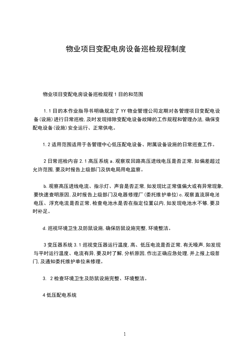 1.1目的本作业指导书明确规定了YY物业管理公司定期对各管理项目变配电设备(设施)进行日常巡检,及时发现排除变配电设备故障的工作规程和管理办法,确保变配电设备(设施)安全运行、正常供电。