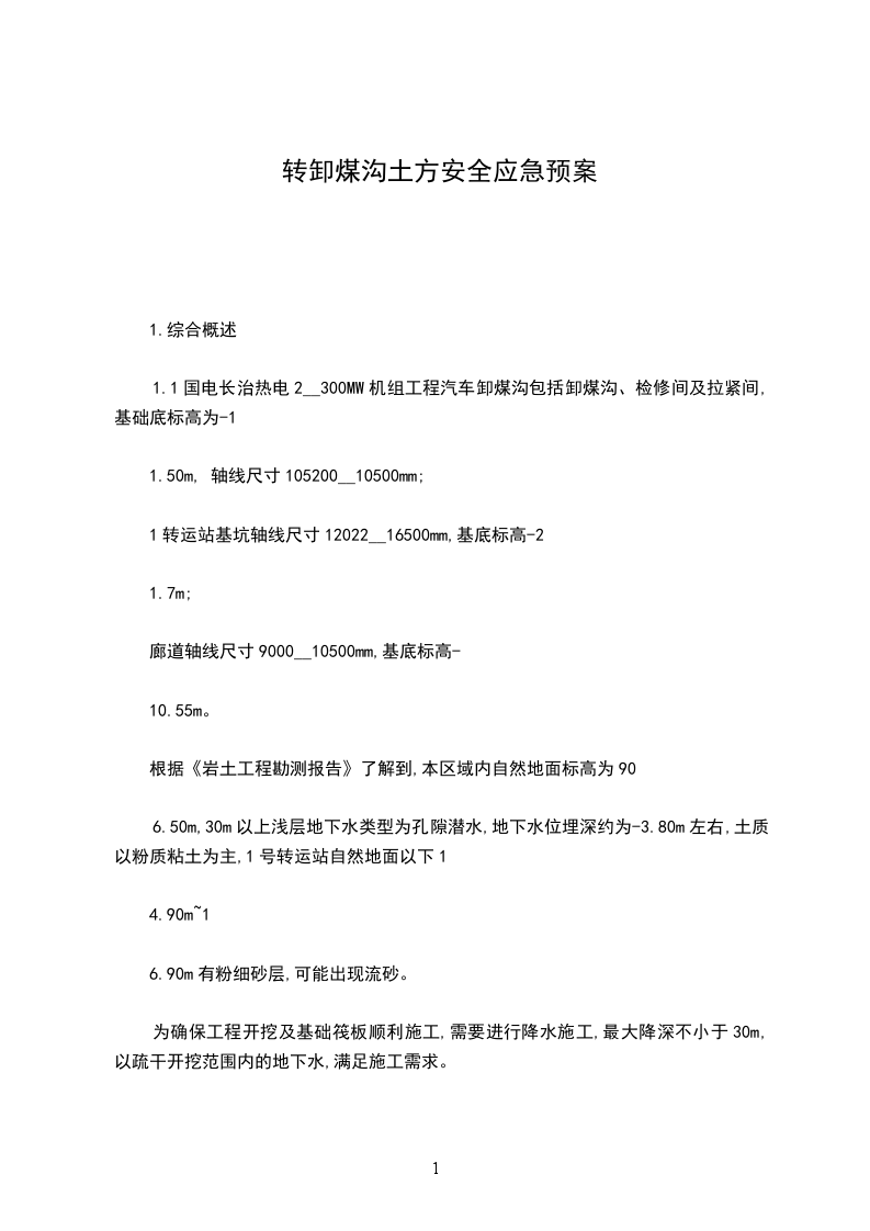1.2为加强汽车卸煤沟、1转运站工程的土方施工安全生产管理,保证土方施工安全生产事故应急救援工作能可靠、高效、有序地进行,最大限度地减轻事故造成的损失,根据《中华人民共和国安全生产法》、《建设工程安全生产管理条例》,以及上级的有关文件精神,结合本工程的实际情况,制定本《土方施工安全应急预案》。