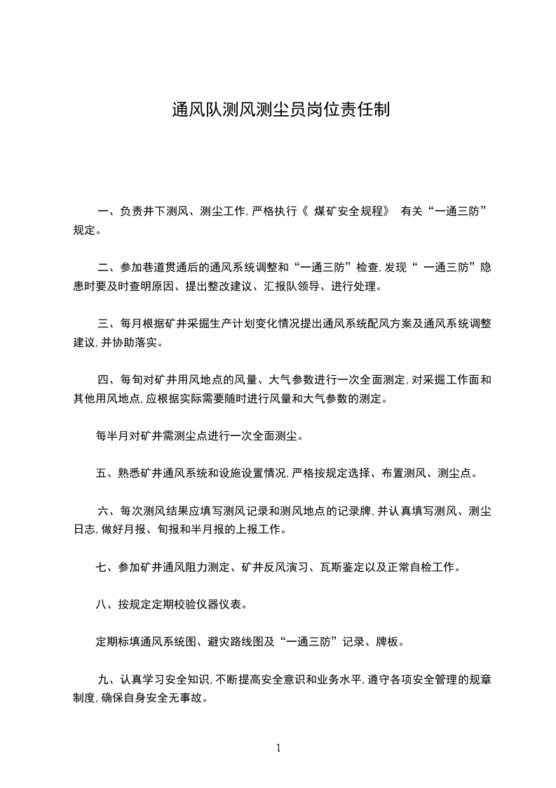 一、负责井下测风、测尘工作,严格执行《 煤矿安全规程》 有关“一通三防”规定。