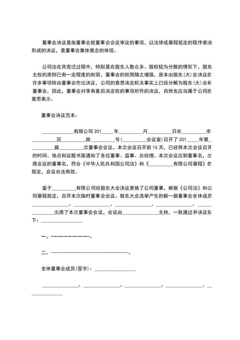 董事会决议涉及业务不得超过公司的经营范围、不得违背国家法律法规、不得损害社会公共利益、不得违背公司章程;否则董事会决议当属无效。全体董事签字盖章:签署时间:________年____月____日