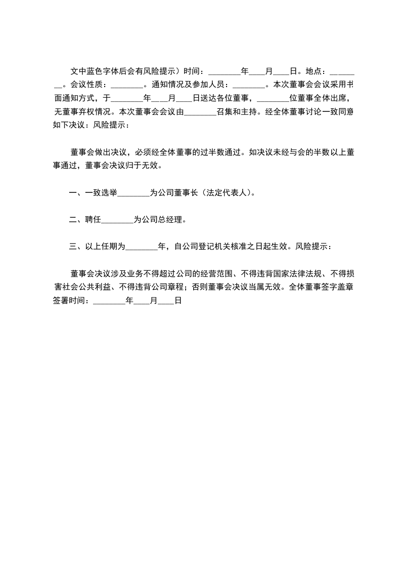 文中蓝色字体后会有风险提示)时间:________年____月____日。地点:________。会议性质:________。通知情况及参加人员:________。本次董事会会议采用书面通知方式,于________年____月____日送达各位董事,________位董事全体出席,无董事弃权情况。本次董事会会议由________召集和主持。经全体董事讨论一致同意如下决议:风险提示: