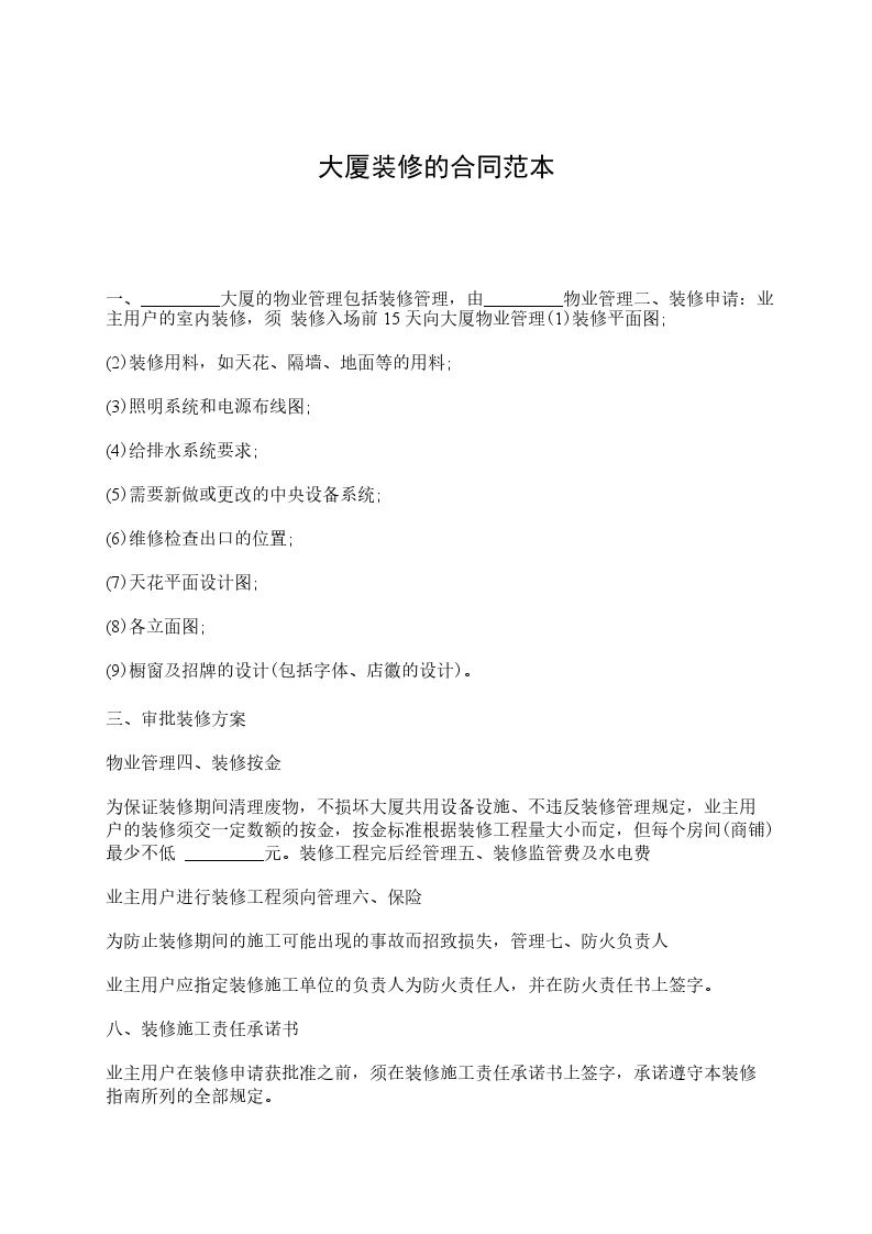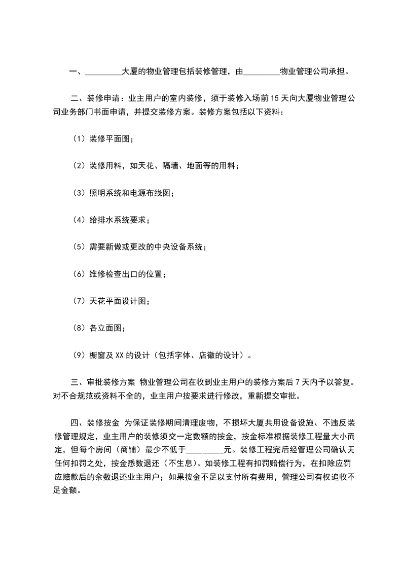 四、装修按金 为保证装修期间清理废物,不损坏大厦共用设备设施、不违反装修管理规定,业主用户的装修须交一定数额的按金,按金标准根据装修工程量大小而定,但每个房间(商铺)最少不低于_________元。装修工程完后经管理公司确认无任何扣罚之处,按金悉数退还(不生息)。如装修工程有扣罚赔偿行为,在扣除应罚应赔款后的余数退还业主用户;如果按金不足以支付所有费用,管理公司有权追收不足金额。