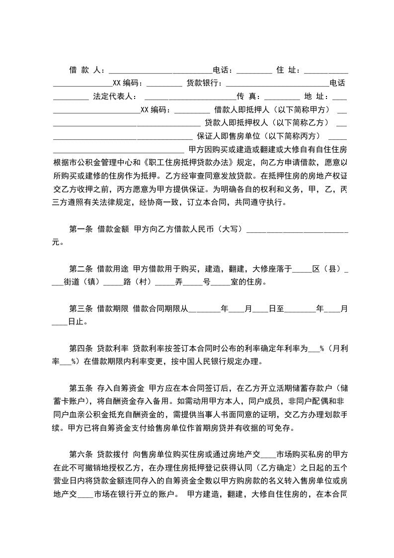 借 款 人:__________________________电话:_________ 住 址:__________________________XX编码:_________ 货款银行:__________________________电话:_________ 法定代表人: _______________________传 真:_________ 地 址:__________________________XX编码:_________ 借款人即抵押人(以下简称甲方) ________________________________________ 贷款人即抵押权人(以下简称乙方) ______________________________________ 保证人即售房单位(以下简称丙方) ______________________________________ 甲方因购买或建造或翻建或大修自有自住住房,根据市公积金管理中心和《职工住房抵押贷款办法》规定,向乙方申请借款,愿意以所购买或建修的住房作为抵押。乙方经审查同意发放贷款。在抵押住房的房地产权证交乙方收押之前,丙方愿意为甲方提供保证。为明确各自的权利和义务,甲,乙,丙三方遵照有关法律规定,经协商一致,订立本合同,共同遵守执行。
