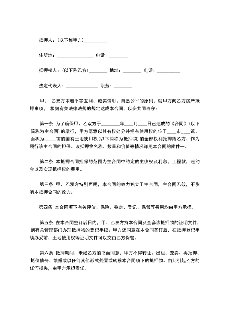 第一条 为了确保甲、乙双方于________年____月____日已达成的《合同》(以下简称为主合同)的履行,甲方愿意以其有权处分并拥有使用权的位于____市____镇,面积为_____亩的国有土地使用权(以下简称为抵押物)的全部权利抵押给乙方,作为履行该主合同的担保。该抵押物名称、数量和价值等情况详见本合同的附件一。