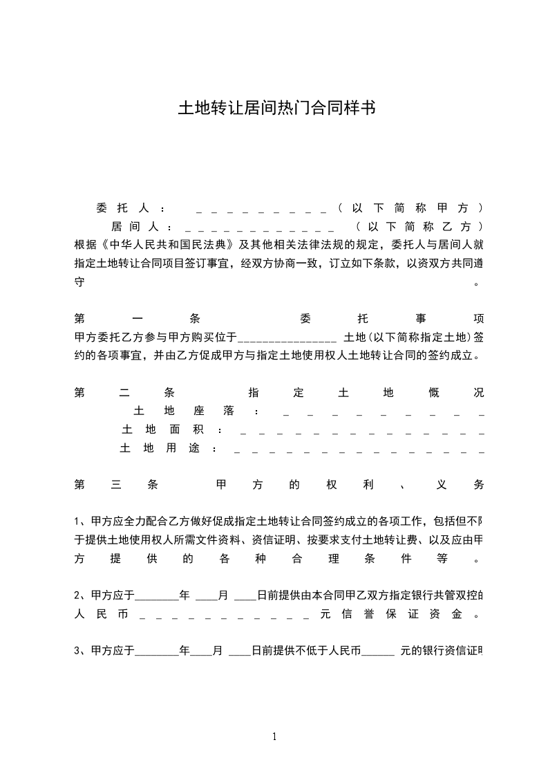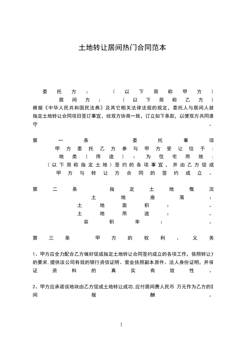 根据《中华人民共和国民法典》及其他相关法律法规的规定,委托人与居间人就指定土地转让合同项目签订事宜,经双方协商一致,订立如下条款,以资双方共同遵守。