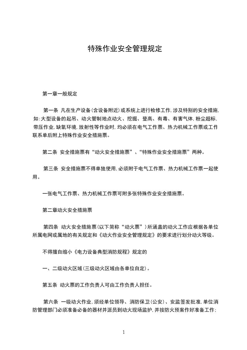 第一条 凡在生产设备(含设备附近)或系统上进行检修工作,涉及特别的安全措施,如:大型设备的起吊、动火管制地点动火、挖掘、登高、有毒、有害气体,粉尘超标,带压作业,缺氧环境,放射性等作业时,均必须在电气工作票、热力机械工作票或工作联系单后附上特殊作业安全措施票。