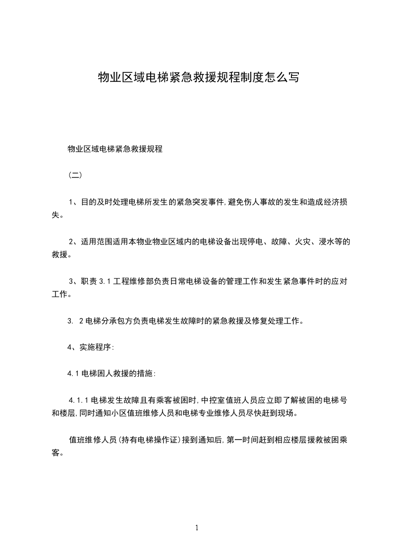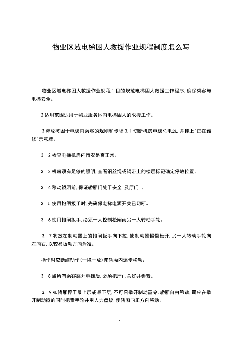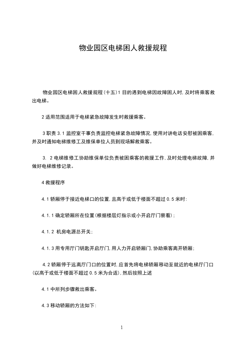 物业园区电梯困人救援规程(十五)1目的遇到电梯因故障困人时,及时将乘客救出电梯。