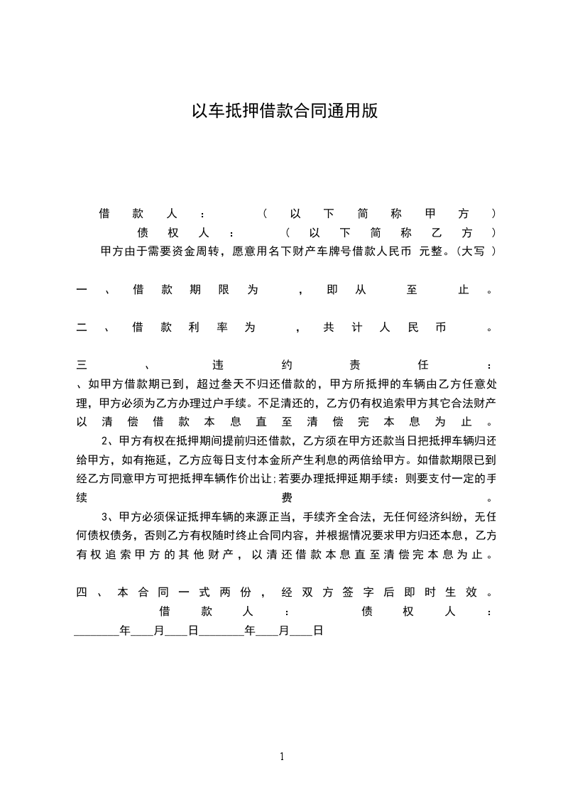 甲方由于需要资金周转,愿意用名下财产车牌号借款人民币 元整。(大写 )