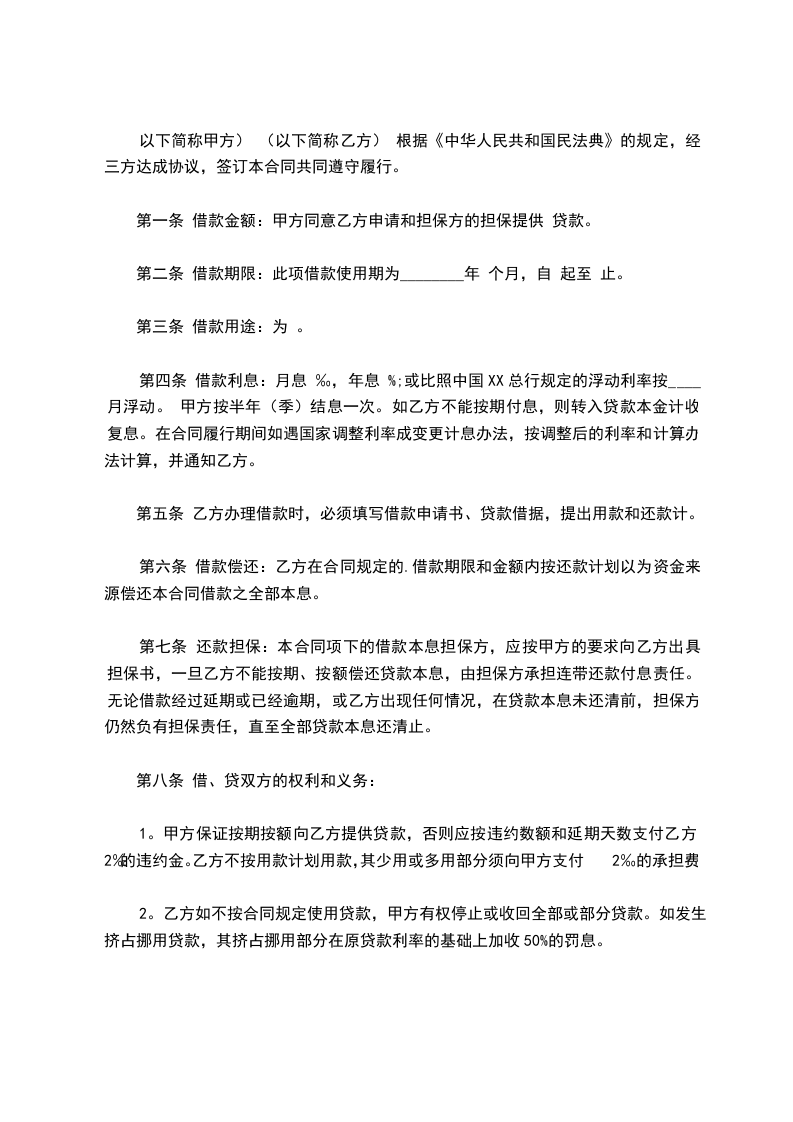 第十条 附则 本合同一式 份,经借、贷方和担保方法定代表人或法定代表人授权的签字人共同盖X后生效。 甲方:(公章) 乙方:(公章) 担保方:(公章)法定代表人:(盖X) 法定代表人:(盖X) 法定代表人:(盖X