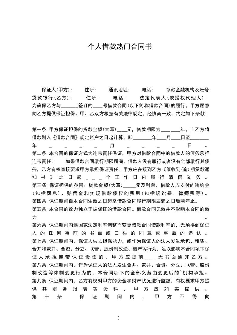 保证人(甲方): 住所: 通讯地址: 电话: 存款金融机构及账号: 贷款银行(乙方): 住所: 电话: 法定代表人(或授权代理人): 为确保乙方与_______签订的____号借款合同(以下简称借款合同)的履行,甲方愿意向乙方提供保证担保。甲、乙双方根据有关法律规定,经协商一致,约定如下条款: