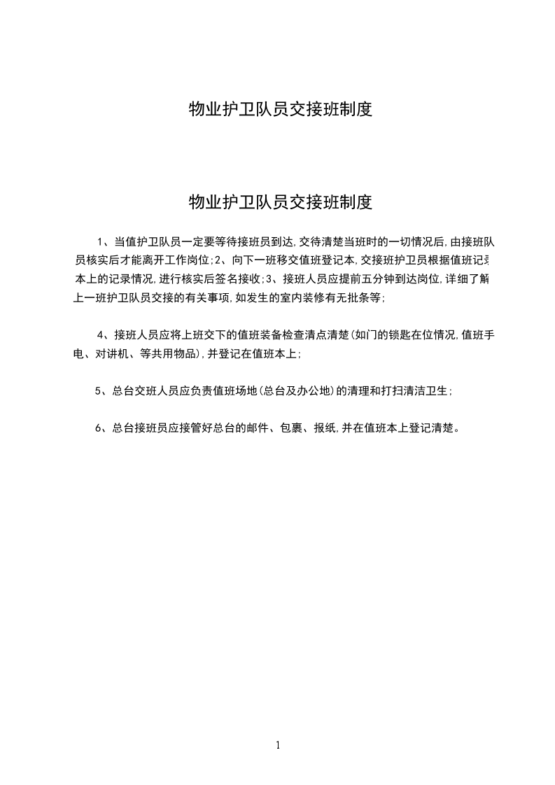 1、当值护卫队员一定要等待接班员到达,交待清楚当班时的一切情况后,由接班队员核实后才能离开工作岗位;2、向下一班移交值班登记本,交接班护卫员根据值班记录本上的记录情况,进行核实后签名接收;3、接班人员应提前五分钟到达岗位,详细了解上一班护卫队员交接的有关事项,如发生的室内装修有无批条等;