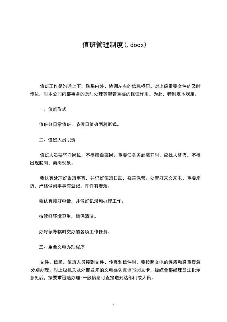 三、值班干部岗位职责公司值班干部由公司各部门管理干部组成,依照值班表安排,依次轮流担任,接受公司值班经理的领导,在公司下班后和节假日其期间,积极配合值班经理完成值班任务。