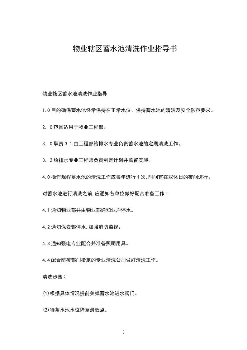 4.0操作规程蓄水池的清洗工作应每年进行1次,时间宜在双休日的夜间进行。