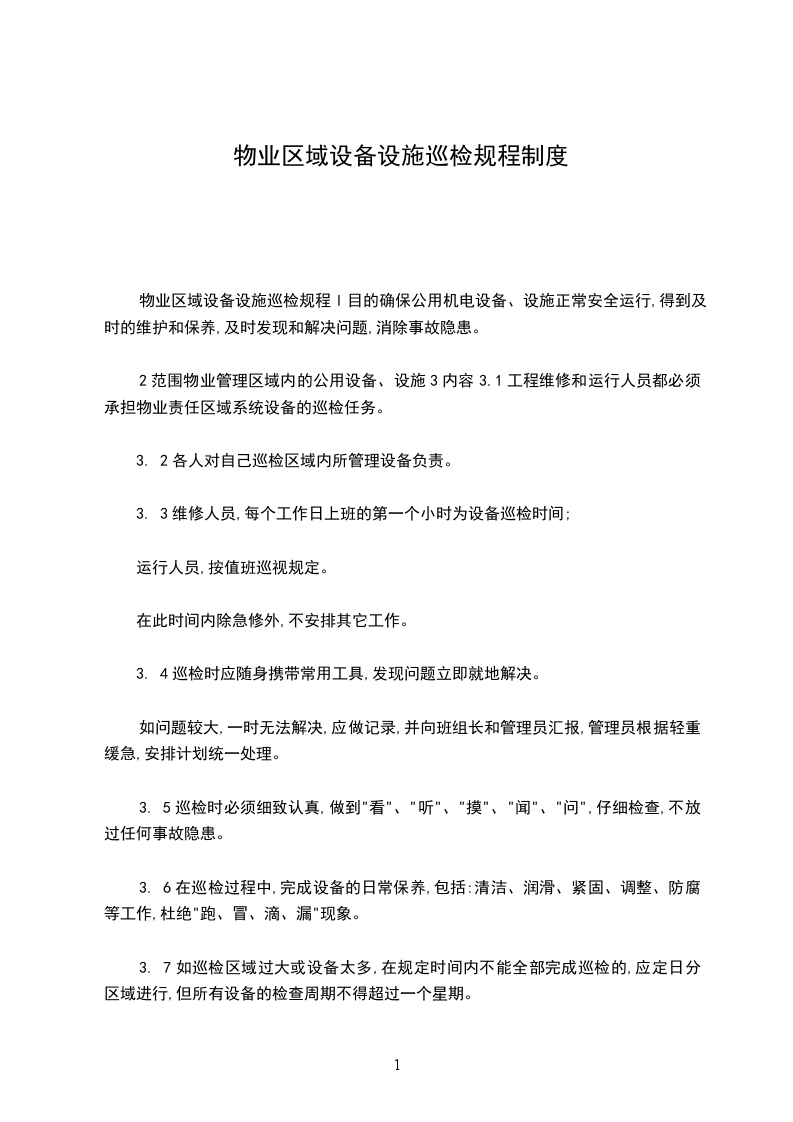 物业区域设备设施巡检规程l目的确保公用机电设备、设施正常安全运行,得到及时的维护和保养,及时发现和解决问题,消除事故隐患。