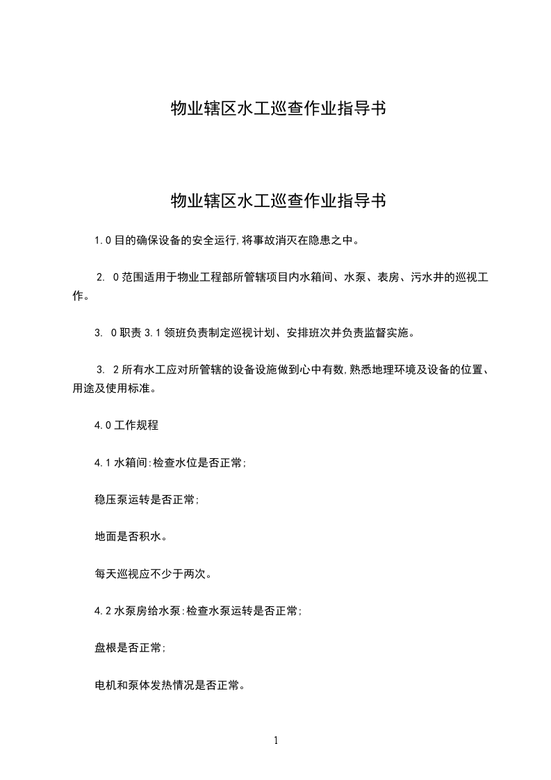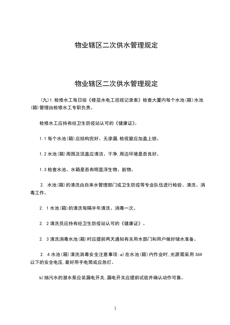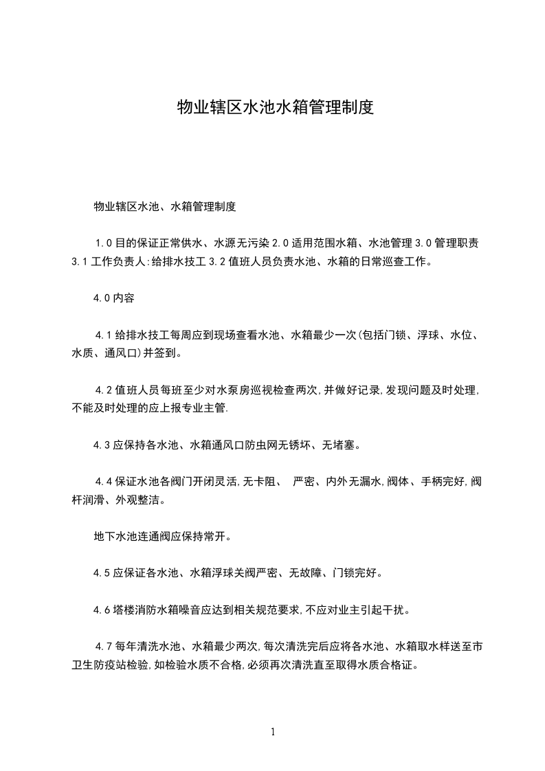 (九)1.检修水工每日按《楼层水电工巡视记录表》检查大厦内每个水池(箱)水池(箱)管理由检修水工专职负责。