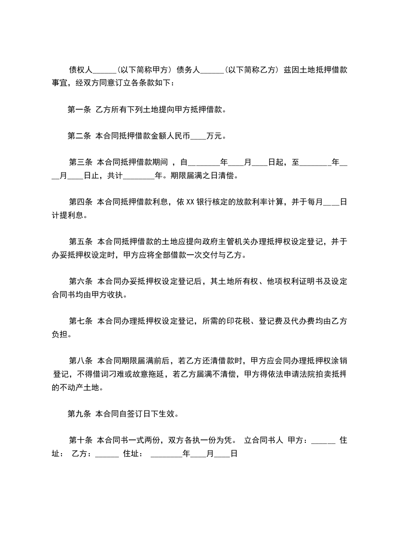 债权人______(以下简称甲方) 债务人______(以下简称乙方) 兹因土地抵押借款事宜,经双方同意订立各条款如下:
