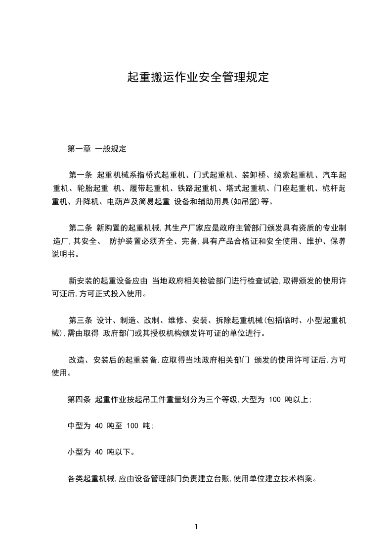 第四条 起重作业按起吊工件重量划分为三个等级,大型为 100 吨以上;
