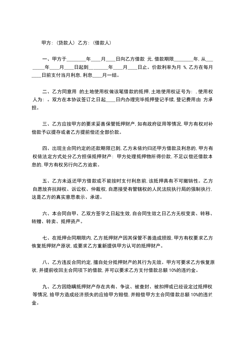 二、乙方同意用 的土地使用权做该笔借款的抵押,土地使用权证号为: ,使用权人为: 。双方在本协议签订之日起____日内办理完毕抵押登记手续,登记费用由 方承担。