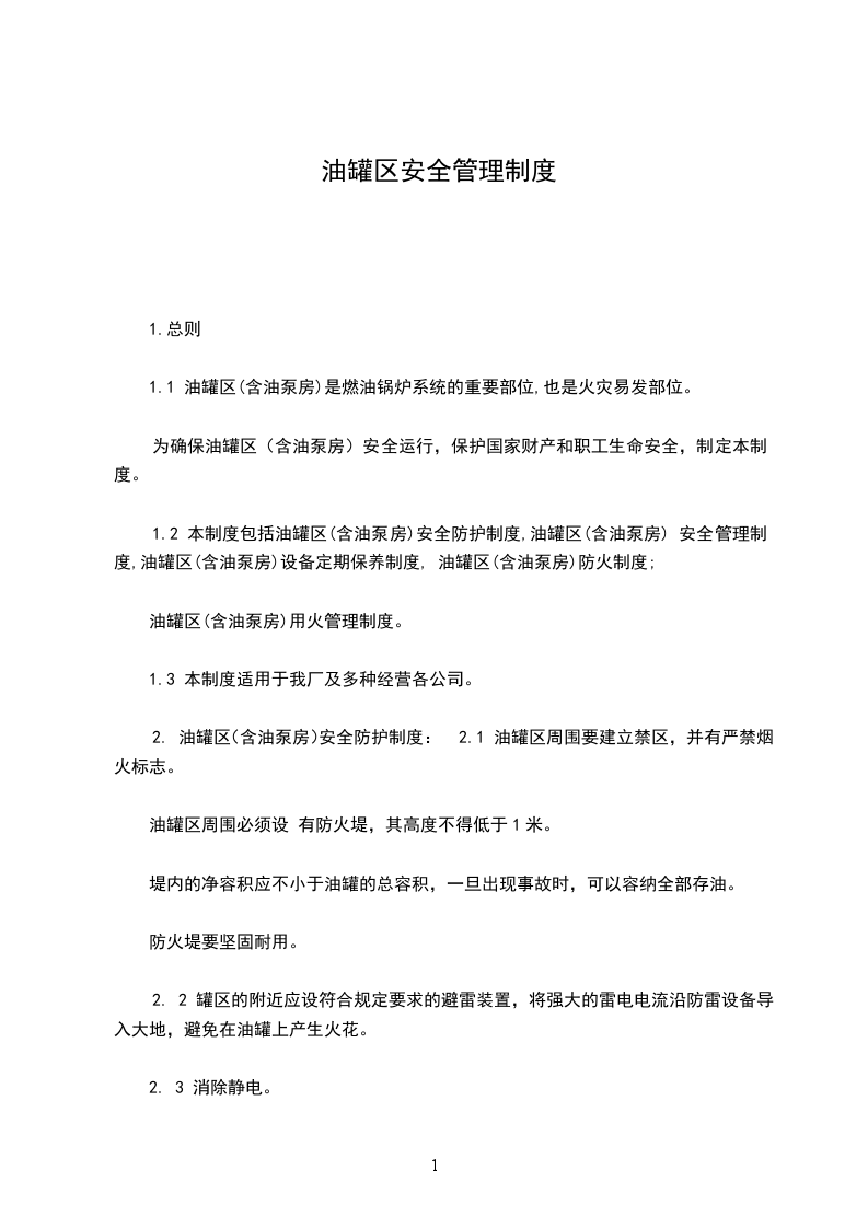 1.2 本制度包括油罐区(含油泵房)安全防护制度,油罐区(含油泵房) 安全管理制度,油罐区(含油泵房)设备定期保养制度, 油罐区(含油泵房)防火制度;