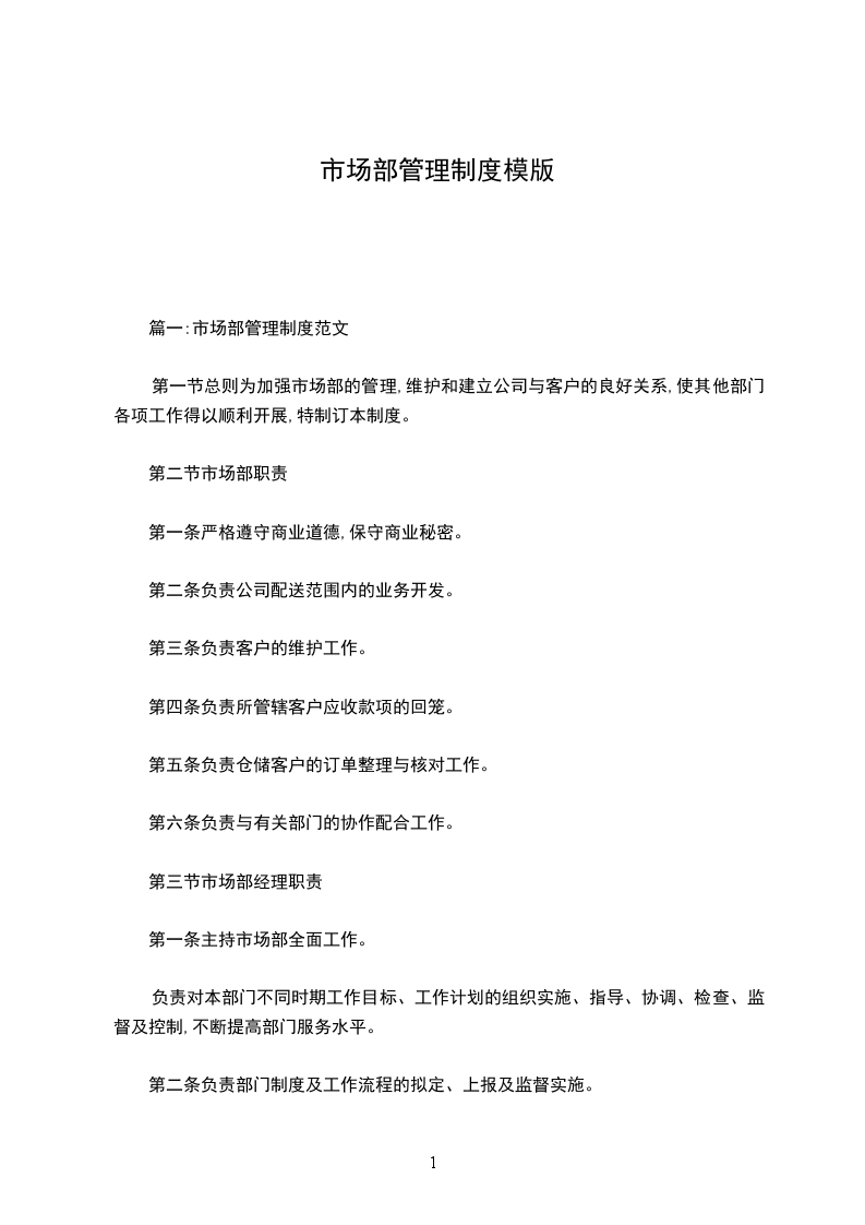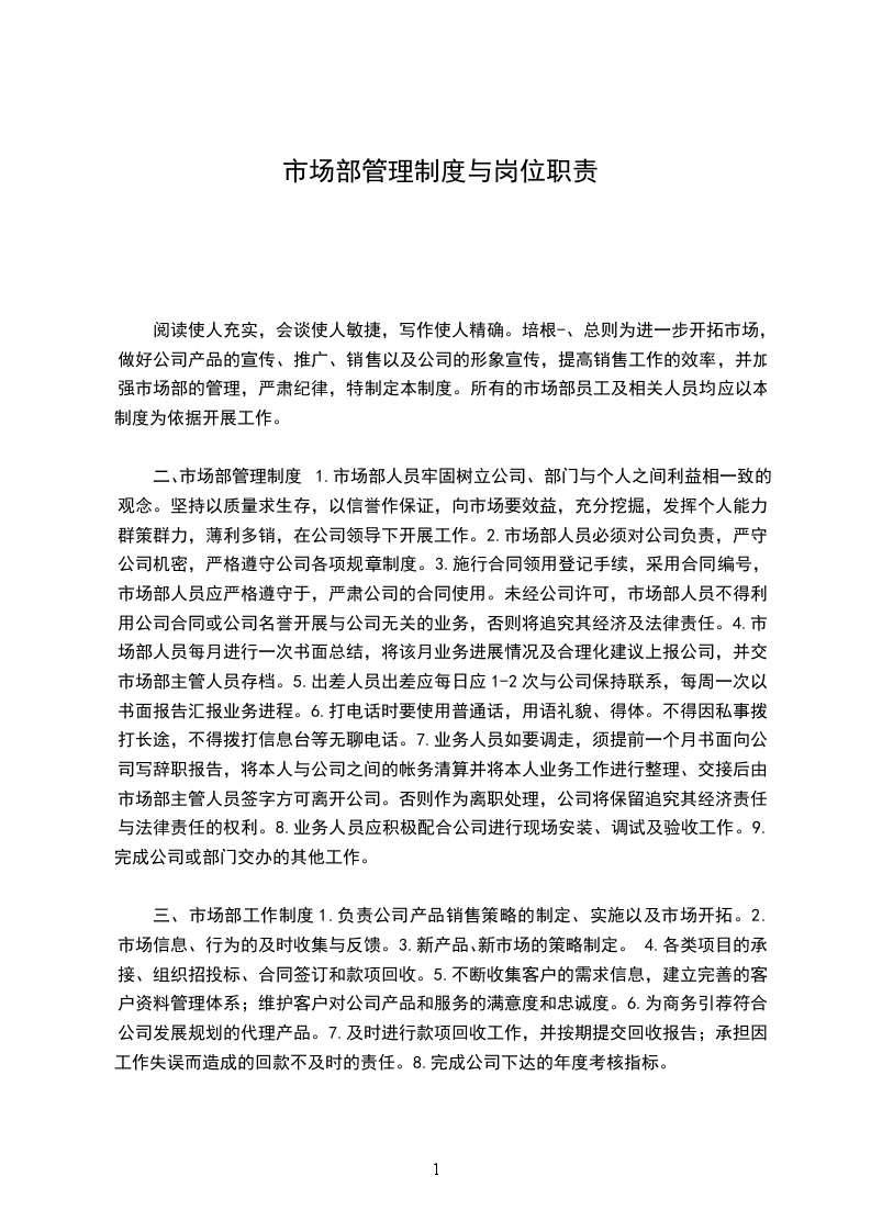第一节总则为加强市场部的管理,维护和建立公司与客户的良好关系,使其他部门各项工作得以顺利开展,特制订本制度。