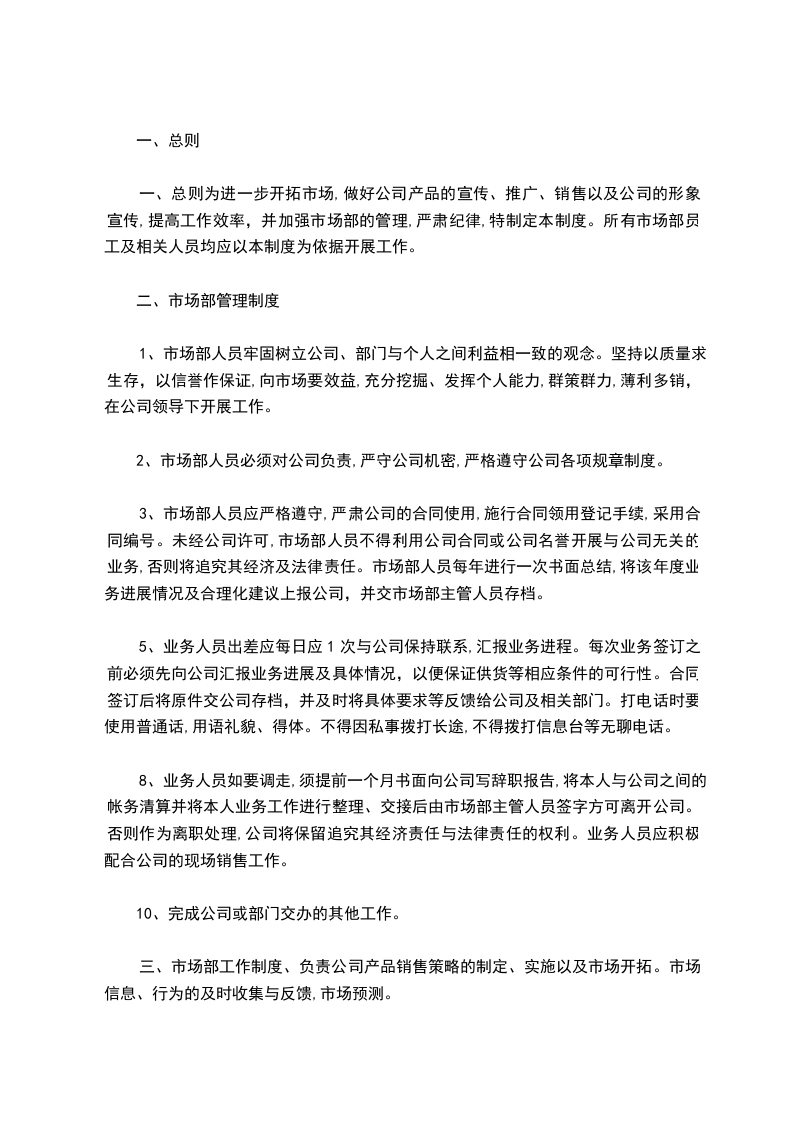 为进一步开拓市场,树立公司的形象,,提高市场部的工作效率,加强市场部的管理,严肃纪律,配合公司”制度化,规范化,程序化”的管理秩序,特制订本制度。