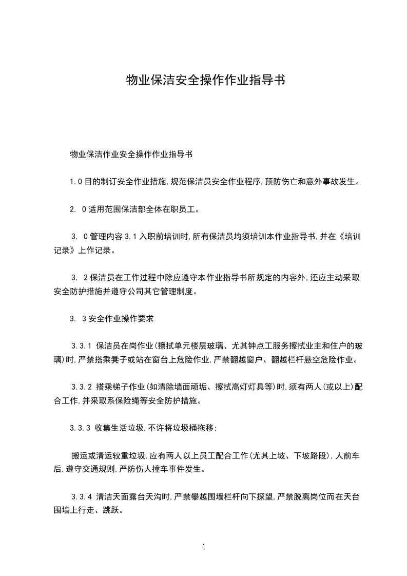 1.0目的制订安全作业措施,规范保洁员安全作业程序,预防伤亡和意外事故发生。