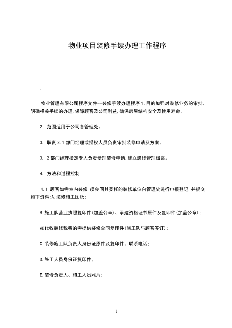 物业管理有限公司程序文件--装修手续办理程序1.目的加强对装修业务的审批,明确相关手续的办理,保障顾客及公司利益,确保房屋结构安全及使用寿命。